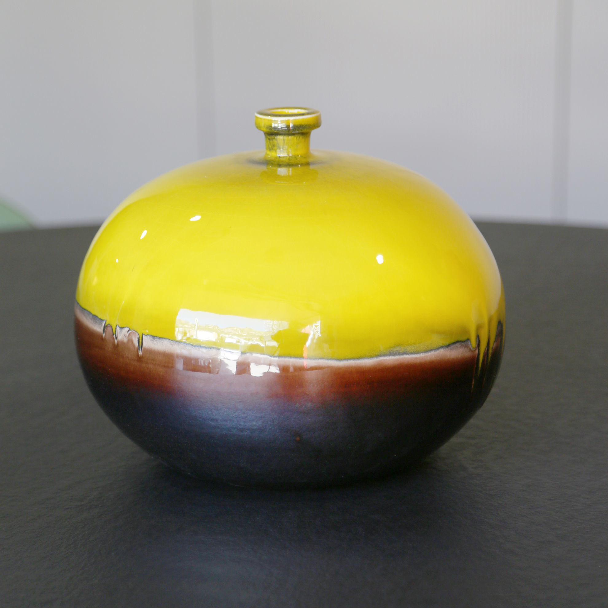 A round-bodied vase with a warm and enveloping character, handcrafted with artisanal care. Its surface features a refined gradient blending luminous yellow with deep brown, creating a natural effect reminiscent of earth and sunlight.